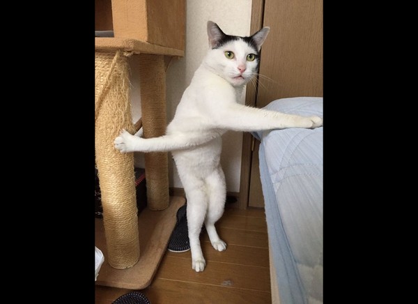 外表冷靜的喵星人犯起蠢來真的會特別好笑!日本1隻乳牛貓雙手交叉分別被卡在床鋪和貓塔的抓板上,只能用後腳站立,且身體呈現奇怪的姿勢,配上一臉無助表情,讓網友全笑翻。