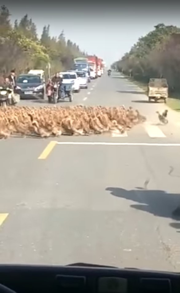 機車、小車和大車見狀都停下來,禮讓大批鴨群;路人也紛紛拿出手機,拍下這難得一見的奇景目擊者說,鴨子如果少100隻,主人都看不出來;還有人驚呼,這群鴨子太成功。