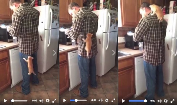 臉書粉絲專頁「Caitlin Metz」分享的這支短片中,男主人站在流理檯旁,似乎專注地在泡東西,小橘子便沿著牛仔褲管邊蹬邊爬,一路往上來到襯衫衣角、寬廣後背,一下子就登上肩膀,完成「人類山」攻頂。
