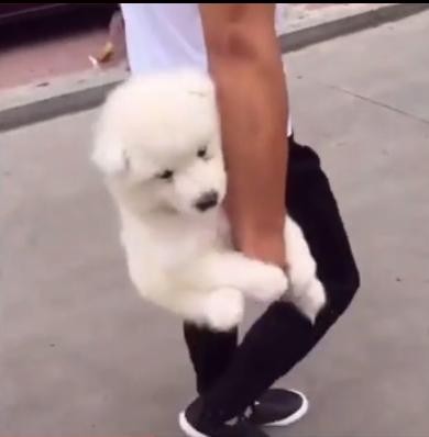 頭條號主《萌寵趣集》發文表示,這隻小薩摩耶個性乖巧,只是有點懶又非常會裝萌,有天跟爸爸出去散步時,覺得好累走不動,就用牠無辜的大眼看著爸爸,一直苦苦哀求,不想要再走了,拔拔凹不過牠的放電雙眼,只好就這樣一把「提起」,因為薩摩耶還是小朋友,所以身材嬌小,壤拔拔直接可以單手提著走在路上,不少路人看到都覺得好萌。