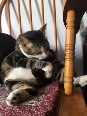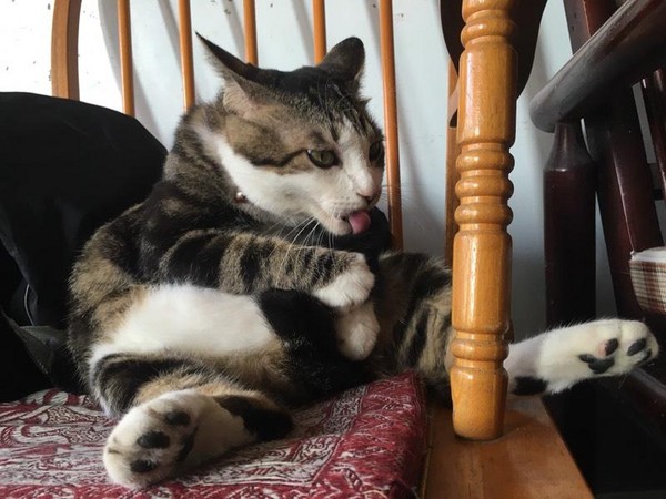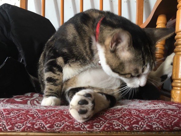 然而,有天貓女發現牠舔尾巴時好像有點「困難」,原來是肚肚太大,儘管已經努力彎腰,仍是一副「好像已經極限」的樣子,最後只好伸手把尾巴抓過來舔,才終於能夠舔得盡興、舔得忘情。