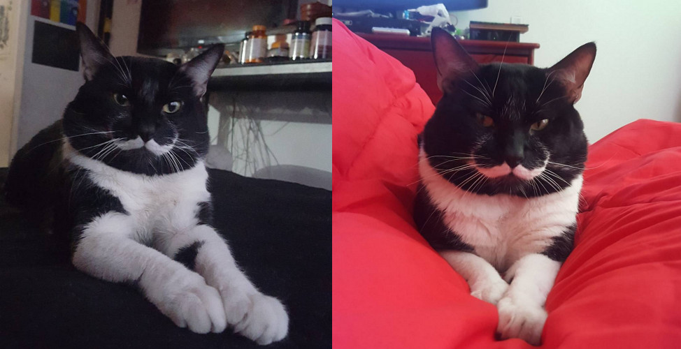 貓咪的天生的毛色與花紋是牠們與生俱來的特色,國外有一隻黑白毛色的貓咪大理(Dali)天生就長著一張「大人臉」,因為牠黑色皮毛的臉上,長了一對可愛的白色翹鬍子,而且左右對稱,比例非常完美,看起來超級霸氣!