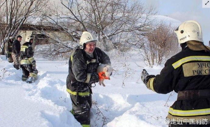 俄羅斯中部托木斯克州(Tomskaya oblast)一個小鎮,上周五有一個私人豬圈在大雪中起火,當地消防員連忙搶救。不少已燻黑的成豬連忙衝出火場,來不及逃出的幼豬則在消防員冒火搶救下,以接力搬運的方式,成功脫困,共救出逾150隻,目前已轉安置於國營農場裡。