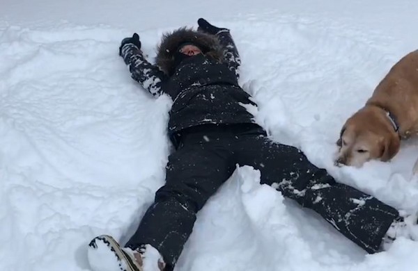 學習從模仿開始,國外一隻大狗狗看到主人躺在地上玩「雪天使」,興奮地跑到旁邊空地上滾來滾去,做了一個狗狗版的雪天使,模樣十分可愛。
