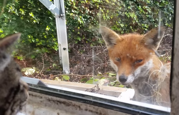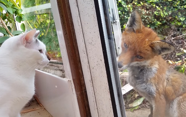 當機靈的狐狸遇到傲嬌的貓皇會擦出什麼火花呢?英國一名網友分享了野生狐狸和貓咪相遇的過程,一隻野生的小狐狸突然登門拜訪,跑來家門口休息,屋內的2隻貓咪和牠隔著玻璃對望10秒,互相打量彼此,初次「面聖」的狐狸歪著頭畫面萌翻許多網友。