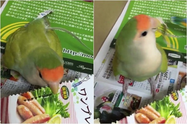 影片中的小鸚在啃咬紙盒時,「切口」非常的整齊,被咬下後的碎紙好像用花邊剪刀剪出的造型般有特色,讓許多網友直呼好可愛~這個將紙條插在羽毛上的舉動,是愛情鳥小鸚的招牌動作之一,尤其是母鳥,為了求偶會用樹葉或紙條等等來裝飾自己的羽毛。