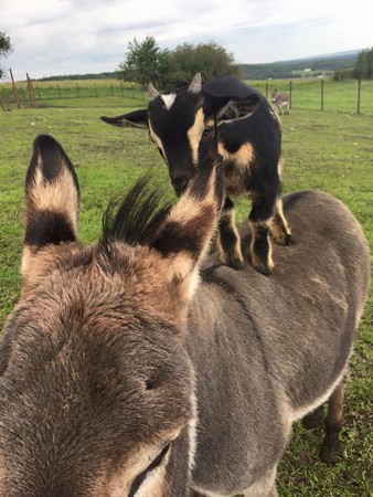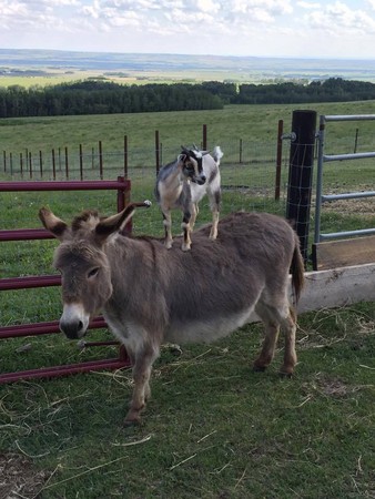 山羊「攀爬」的本事相當高明,經常可以看見牠們爬上非常險峻的地方,但你看過山羊爬到驢子的背上「騎驢」嗎?最近網路上流傳一部超紅的影片,就是一頭加拿大小山羊悠閒地踩在驢子背上,被驢子載著在農場裡散步,而且驢子看起來似乎完全不反感!