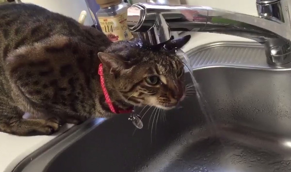 「喵星人這樣子喝水,也未免太費工夫啦。」日本網友ユウさん在推特上分享家中虎班喵喝水的方法,只見牠身體趴在流理臺旁,頭頂著水龍頭,不停吐出舌頭想要喝水,但水一直流過牠的眼前,卻怎樣也喝不到,可愛的模樣全被主人記錄下來,短短7秒的影片,不到一日已有4萬多名網友轉貼。