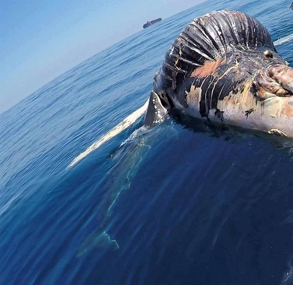 ▲一頭母鯊大口啃鯨魚屍體「養胎」。(圖/翻攝自Keith Poe臉書影片,下同)