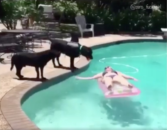 夏日炎炎,不少愛玩水的汪星人看到泳池都會忍不住跳進去清涼一下,臉書粉絲專頁Fluffy Lovers於3日分享一則影片,短片中有兩隻黑色大狗正盯著水中的比基尼正妹,其中一隻戴著鯊魚鰭救生衣的狗狗,一個衝動直接往正在水上的正妹跳過,打亂了在享受的她並跌入水中。