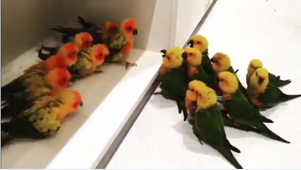 動物之間總會有互看不順眼的示威行為出現,但能夠「撂」出一群同花色的兄弟們來助陣很不容易。加藤軍台灣粉絲團 2.0粉絲專頁日前貼出影片,兩種鸚鵡在互相叫囂,一邊是在箱子內的金太陽鸚鵡、另一邊是在箱子外的金頭凱克,兩個品種的共同點是叫聲都很大且尖銳,互相叫囂起來非常吵鬧。
