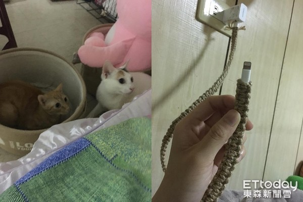 ▲會把線咬斷的白貓;麻繩編織出充電線的金鐘罩。(圖/網友張藝瓊提供)