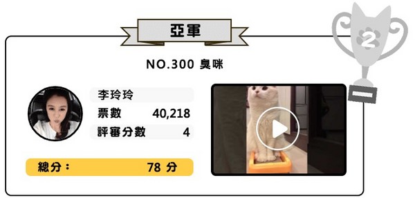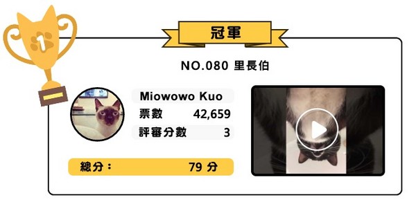 既然是徵選,就總得選個冠亞季軍,貓爸貓媽為了替自家貓兒拉票,也是卯足全力,白天親自跟同事同學拜票,晚上FB、LINE號召親朋好友投票,擺出一副選總統的陣仗,根本就是喵星人統治地球的節奏啊!經過激烈選拔,冠亞季軍分別出爐!