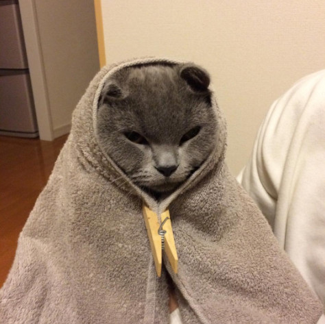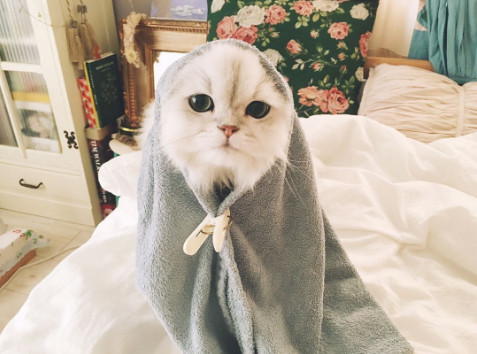 這隻貓咪完美示範了什麼叫做顏質決定一切,普通的毛巾包在牠身上硬生生變得貴氣啊~果然貓正穿什麼都好看!