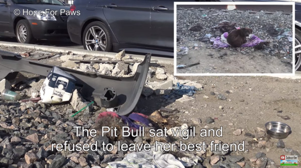 有時候動物之間的情誼,往往比人類堅定多了。美國洛杉磯動物救援組織希望爪子(Hope For Paws)接到求救電話表示,有隻比特犬和貴賓一起被棄養在鐵路旁,貴賓狗不敵野外危險的環境已經往生,而這隻比特犬就這樣孤零零的守在好友的身邊長達2個星期,並且拒絕離開。