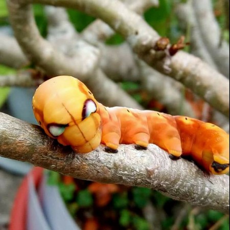 有網友在朋友家裡發現一隻橘色毛毛蟲,仔細一看發現牠有著跟「鋼鐵人」一樣的明星臉,他馬上把照片上傳發問這到底是什麼蟲?引起網友熱烈討論,「鋼鐵蟲」、「假面超人蟲」、「摩斯拉」,但真正的答案其實是夾竹桃天蛾的幼蟲。
